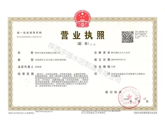 陜西宇強(qiáng)水泥制品有限公司的營業(yè)執(zhí)照!